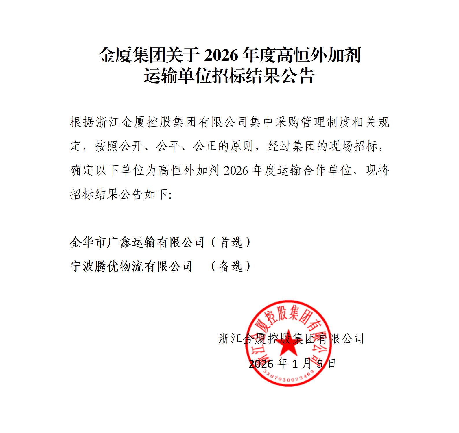 金廈集團(tuán)關(guān)于2026年度高恒外加劑 母液戰(zhàn)略合作供應(yīng)商招標(biāo)結(jié)果公告
